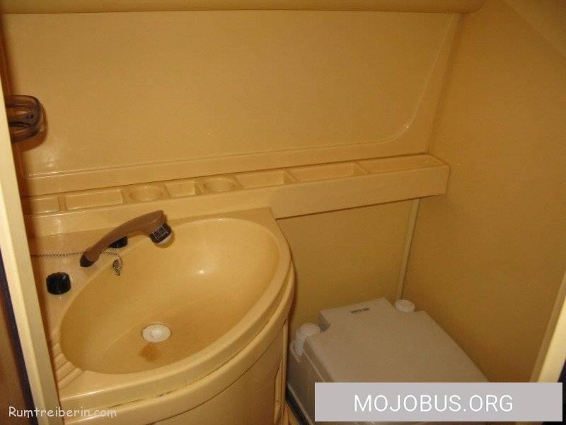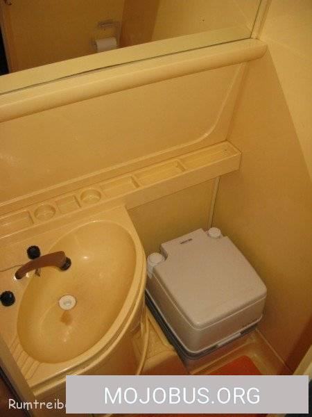 Unser Badezimmer urmelig….der Spiegel läßt mich immer faltenlos aussehen 😎 Die Campingtoilette wie so oft ein Trainings und Fitnessgerät….Kniebeugen sind so gesund ! Das typische Hobby600 Badambiente…senfgelb 😉